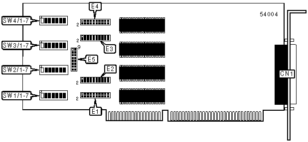 SW4 sets the I/O addresses for port1, SW 3 sets the I/O addresses for port 2, SW2 sets the I/O addresses for port 3, and SW1 sets the I/O addresses for port 4. A total of 128 base address settings are available. The switches are a binary representation of the decimal memory addresses. SW1-4/1 is the Most Significant Bit and switch SW1-4/7 is the Least Significant Bit. The switches have the following decimal values:SW1-4/1=1024, SW1-4/2=512, SW1-4/3=256, SW1-4/4=128, SW1-4/5=64, SW1-4/6=32, SW1-4/7=16. Turn off the switches and add the values of the switches to obtain the correct memory address. (On=0, Off=1)