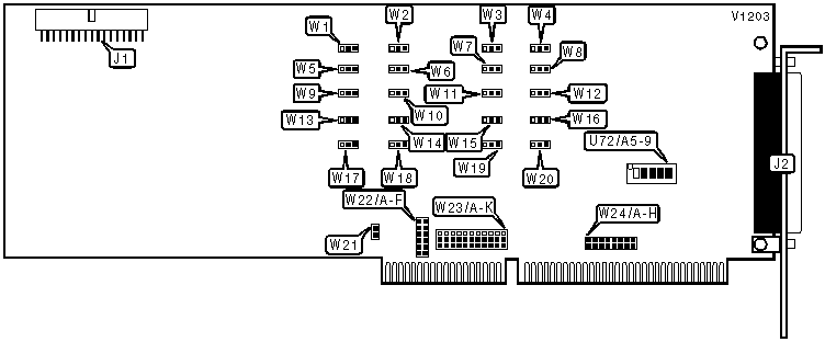 Note: A total of 255 base address settings are available. The switches are a binary representation of the decimal memory addresses. Switch A9 is the Most Significant Bit and switch A5 is the Least Significant Bit. The switches have the following decimal values: switch A9=512, A8=256, A7=128, A6=64, A5=32. Turn off the switches and add the values of the switches that are off to obtain the correct memory address. (Off=1, On=0)
