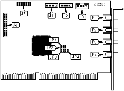 Microphone jack, Line in, Line out, Speaker connector, Game/MIDI port (internal), Wave table