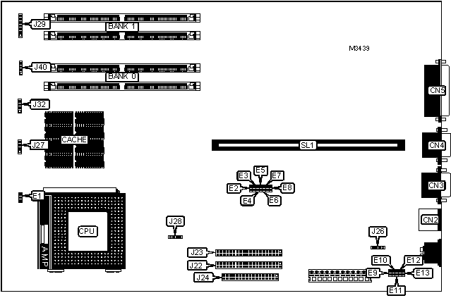Note: E1 is used for factory installed P75, P90 & P100 CPUs. Future upgrades may require a change in this jumper position. If a 60MHz CPU is installed, this jumper isn't used. |