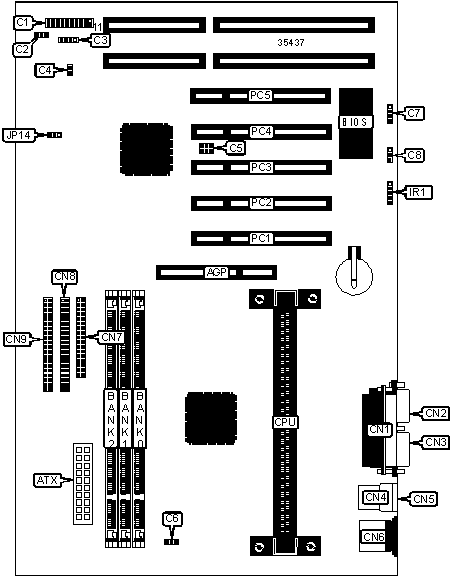 32-bit PCI slots (5), floppy drive interface, IDE interfaces (2), parallel port, PS/2 mouse port, serial ports (2), IR connector, USB connectors (2), ATX power connector, AGP slot |