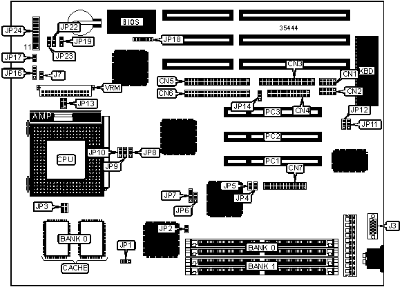 32-bit PCI slots (3), floppy drive interface, IDE interfaces (2), parallel port, serial ports (2), VGA feature connector, VGA port, VRM connector