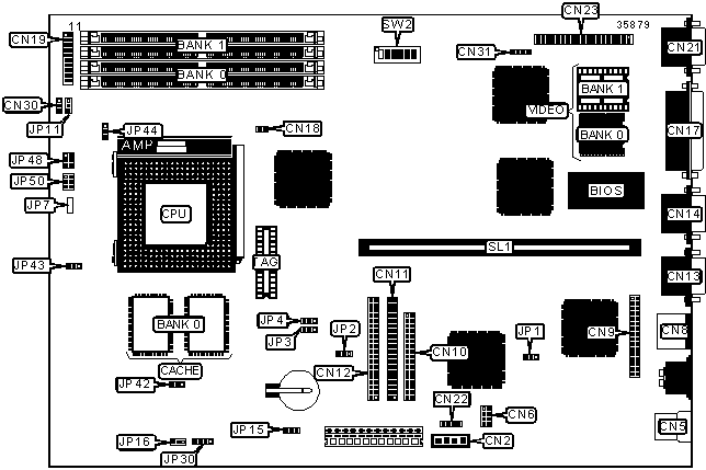 Floppy drive interface, green PC connector, IDE interfaces (2), parallel port, PS/2 mouse port, serial ports (2), VGA port, riser slot, USB connector, line in, wavetable connector, audio in – CD-ROM
