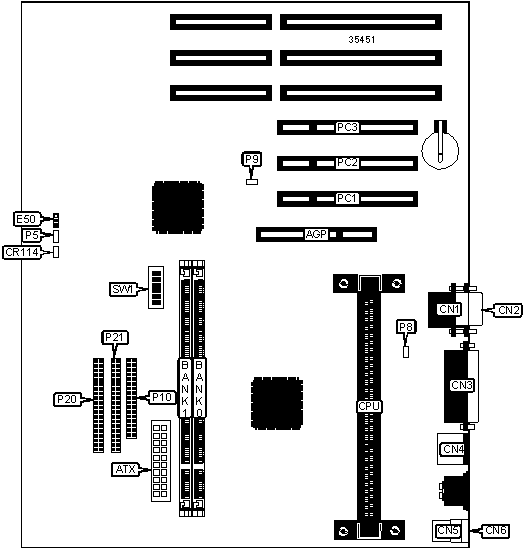 32-bit PCI slots (3), floppy drive interface, IDE interfaces (2), serial ports (2), parallel port, PS/2 mouse port, USB connectors (2), ATX power connector, AGP slot