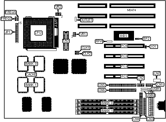 32-bit PCI slots (4), floppy drive interface, green PC connector, IDE interfaces (2), parallel port, serial ports (2), IR connector, remote power switch, monitor outlet connector, remote power on connector, USB connectors (2)