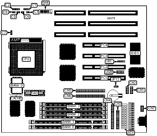 32-bit PCI slots (4), floppy drive interface, IDE interfaces (2), parallel port, PS/2 mouse interface, serial ports (2), IR connector, USB connector, ATX power connector
