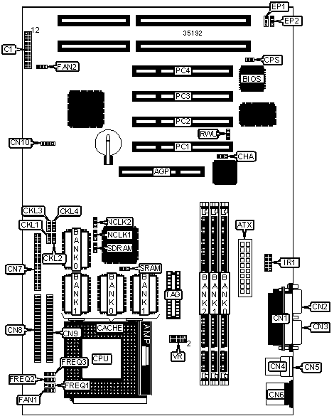 32-bit PCI slots (4), floppy drive interface, green PC connector, IDE interfaces (2), parallel port, PS/2 mouse port, serial ports (2), IR connector, FUSB connector, USB connectors (2), ATX power connector, AGP slot