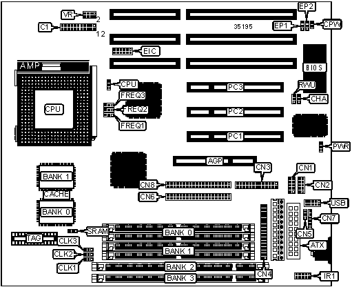 32-bit PCI slots (3), floppy drive interface, green PC connector, IDE interfaces (2), parallel port, PS/2 mouse interface, serial ports (2), IR connector, USB connector, ATX power connector, AGP slot