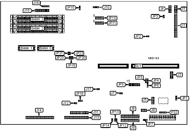 Floppy drive interfaces (2), IDE interface, parallel port, serial ports (2), scanner port, drawer port, printer power connector, numeric display connector, external numeric display connector, internal numeric display connector, external keyboard connector, keyboard controller interface, numeric display power connector, printer power connector, riser slot
