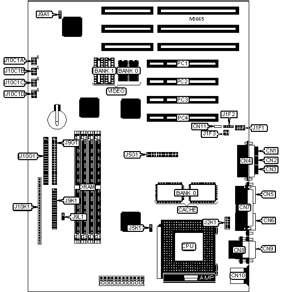 Note: Board accepts EDO memory. The location of banks 0 & 1 are unidentified. Board also accepts x 36 SIMMs. | ||