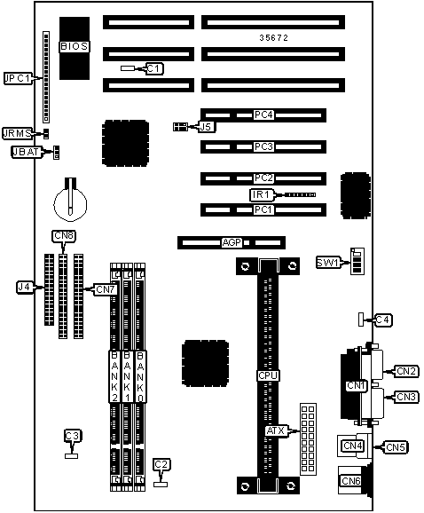 32-bit PCI slots (4), floppy drive interface, green PC connector, IDE interfaces (2), parallel port, PS/2 mouse port, serial ports (2), IR connector, USB connectors (2), ATX power connector, AGP slot, SB-link connector