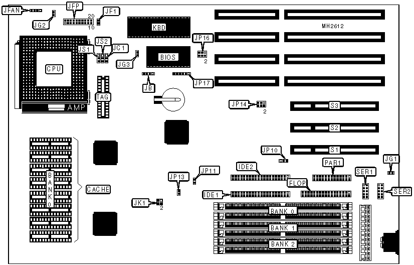 32-bit PCI slots (3), floppy drive interface, green PC connector, IDE interface (2),