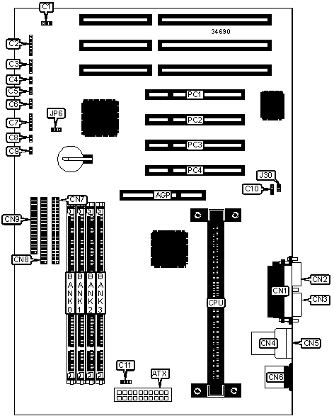 32-bit PCI slots (4), floppy drive interface, green PC connector, IDE interfaces (2), parallel port, PS/2 mouse port, serial ports (2), IR connector, USB connectors (2), ATX power connector, AGP slot
