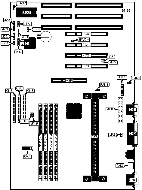 | CPU fan connector | FAN1 | 32-bit PCI slots | PC1 - PC4 |