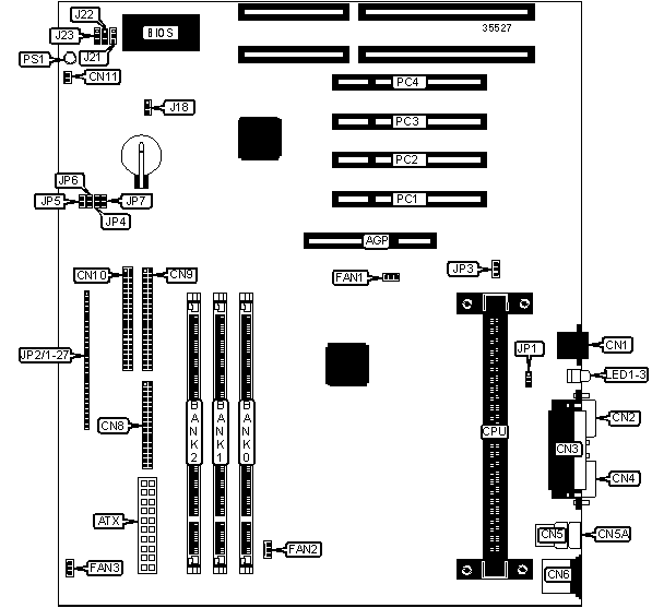 32-bit PCI slots (4), floppy drive interface, IDE interface (2), parallel port, PS/2 mouse port, serial ports (2), IR connector, USB connectors (2), AGP slot, RJ-45 LAN connector, wake on LAN connector