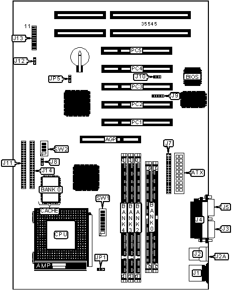 32-bit PCI slots (5), floppy drive interface, IDE interfaces (2), parallel port, PS/2 mouse port, serial ports (2), IR connector, USB connectors (2), ATX power connector, AGP slot |