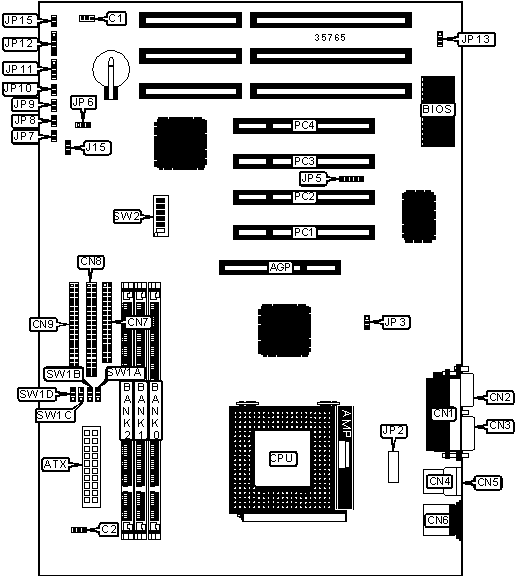 32-bit PCI slots (4), floppy drive interface, green PC connector, IDE interfaces (2), parallel port, PS/2 mouse port, serial ports (2), IR connector, USB connectors (2), ATX power connector, AGP slot, wake on LAN connector