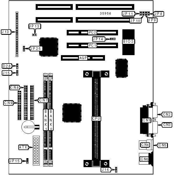 | AGP slot | AGP | Green PC connector | J13/pins 3 & 4 |