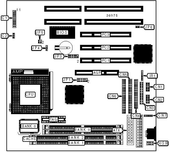 32-bit PCI slots (3), floppy drive interface, IDE interfaces (2), parallel port, PS/2 mouse interface, serial ports (2), IR connector, USB connector, ATX power connector, AGP slot |