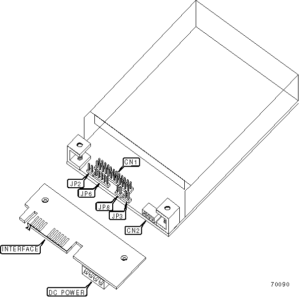 Note: An adapter board with a 4-pin power connector, and a 34 pin card-edge floppy interface connector is included with the drive (see diagram). The only reasons to remove the card are: a) Drive will not fit into case with adapter board installed. b) Only interface connectors available on data cable are header connectors. c) Only power connector available is mini floppy format. d) Jumper settings must be altered. | |||